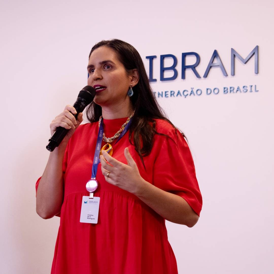 Abrindo o evento, recebemos no palco a Gerente de Pesquisa e Desenvolvimento do Instituto Brasileiro de Mineração (IBRAM), Cinthia Rodrigues, anunciando uma importante  novidade: um novo projeto entre o Mining Hub e o IBRAM para fomentar a divulgação e acesso à inteligência artificial na mineração.