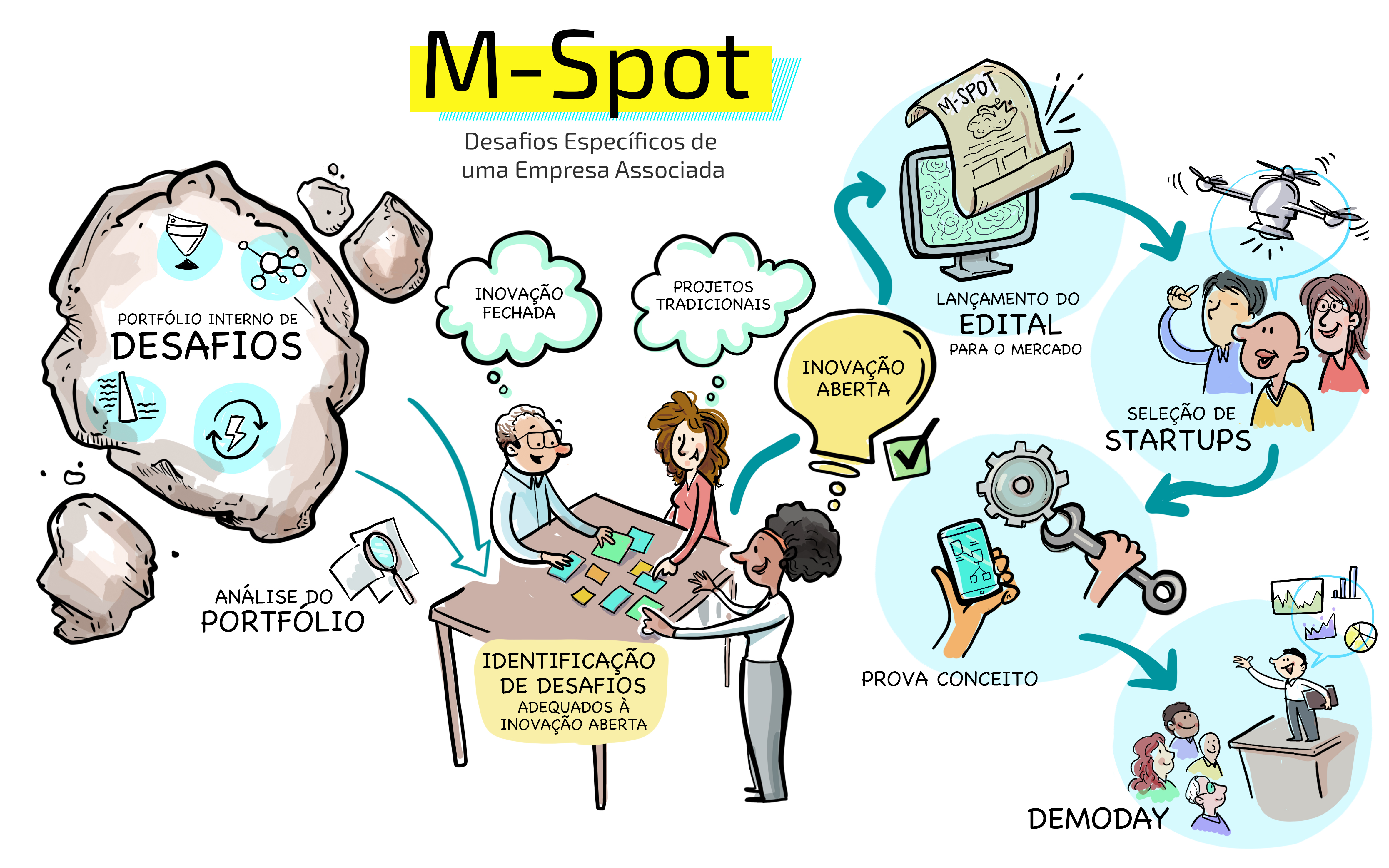 A participação no M-Spot não é atrelada a qualquer cessão de participação societária pela startup.  No M-Spot, serão desenvolvidas  provas de conceito (POCs) para resolução de desafios específicos.